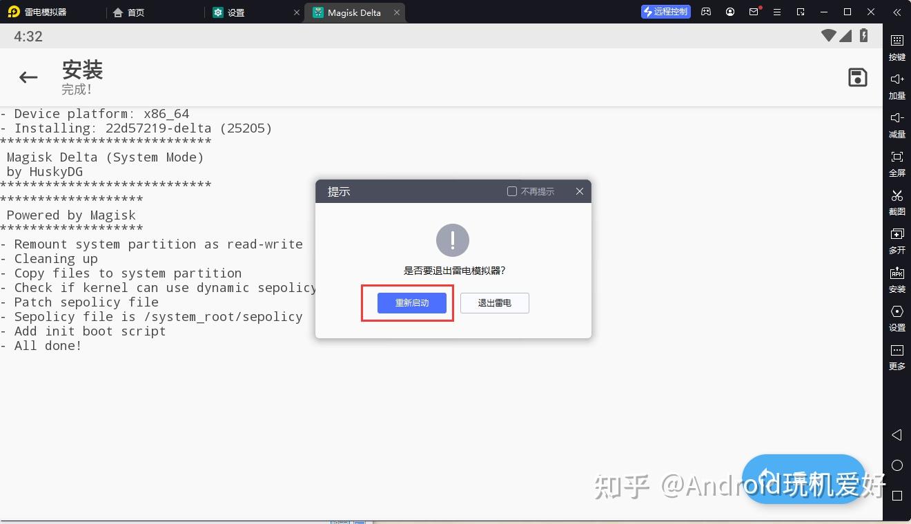 步骤五.刷入完成之后 ,点击模拟器关闭标志X,选择重新启动,等待启动模拟器完毕之后,打开面具magisk,猎豹直装v9.3.9最新版本更新内容出现检测到不属于magisk面具的su文件 ,点击确定即可 。会出现不属于magisk的su文件弹窗