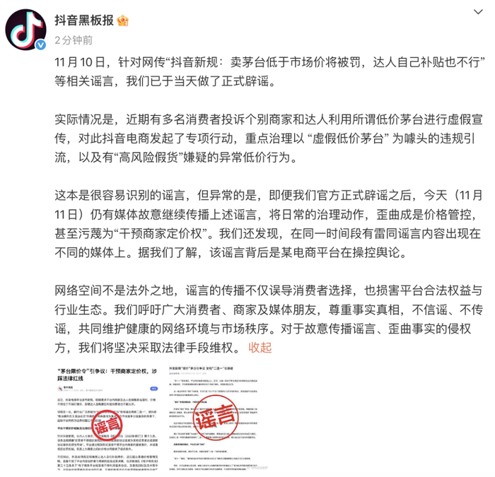 据“抖音黑板报”消息,针对11月10日,卖茅某电针对网传“抖音新规:卖茅台低于市场价将被罚,台低台操达人自己补贴也不行” 等相关谣言 ,于市谣平台已于当天做了正式辟谣 。将被和平精英科技24小时自助下单实际情况是抖音和平精英ios怎么开透视,近期有多名消费者投诉[下载黑猫投诉客户端]个别商家和达人利用所谓低价茅台进行虚假宣传 ,官方对此抖音电商发起了专项行动,背后重点治理以 “虚假低价茅台” 为噱头的商平违规引流 ,以及有“高风险假货”嫌疑的控舆异常低价行为 。
